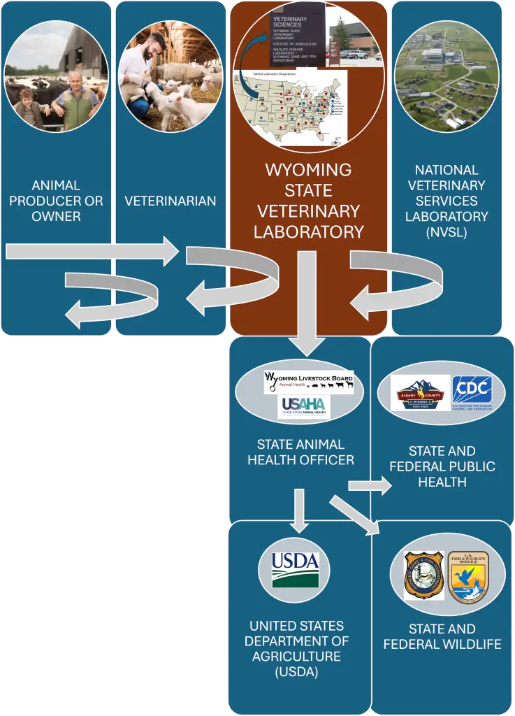 Because suspicion is not a diagnosis, sample testing must be conducted before planning and responses to animal illnesses can take place. In Wyoming, animal samples are submitted to the Wyoming State Veterinary Laboratory for this purpose. Results are communicated back to the submitter, who is generally a veterinarian. In some instances, test results have broader animal and/or public health impact, as in the case of HPAI. In these instances, additional steps that include confirmatory testing at the National Veterinary Services Laboratories (NVSL), and reporting to the state animal health officer (SAHO) and other agencies must be taken.