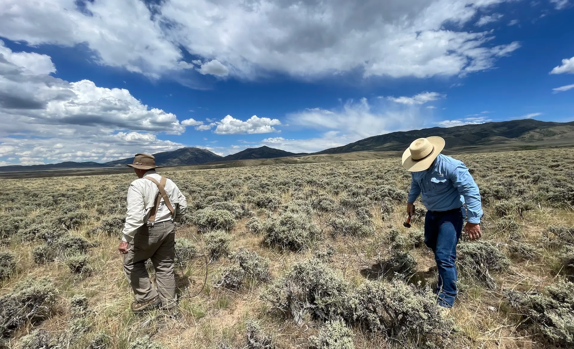 older man wearing hat and long-sleeved shirt with pants held up by suspenders, carrying a metal hoop, and a younger man wearing a cowboy hat, long-sleeved shirt, and jeans, carrying a hammer, walk through clumps of sagebrush with mountains on the horizon and blue sky with clouds overhead