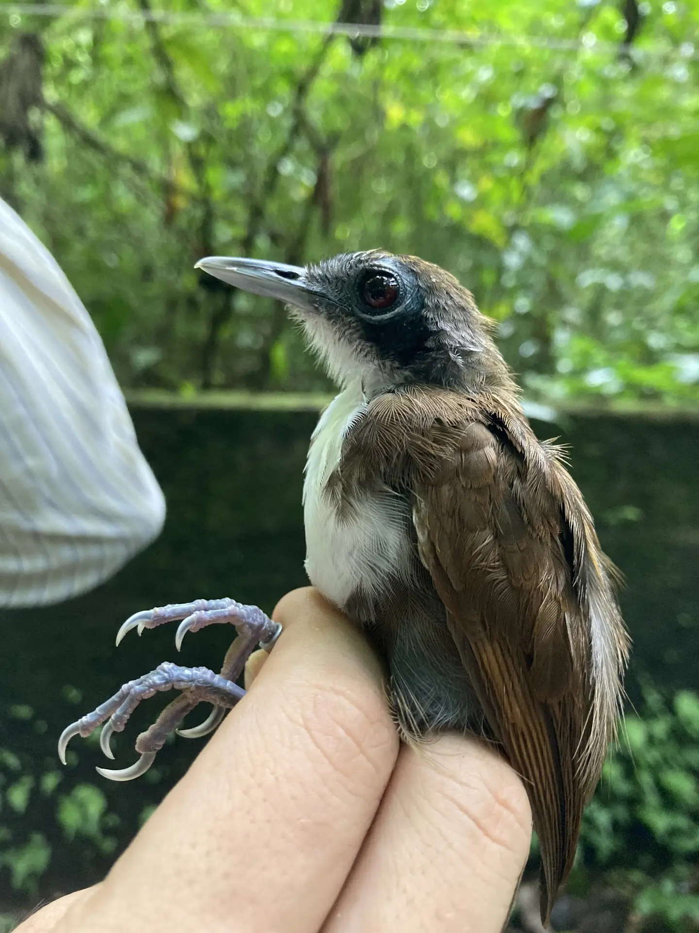A small brown bird with a white chest and throat and a blue ring around its eye.