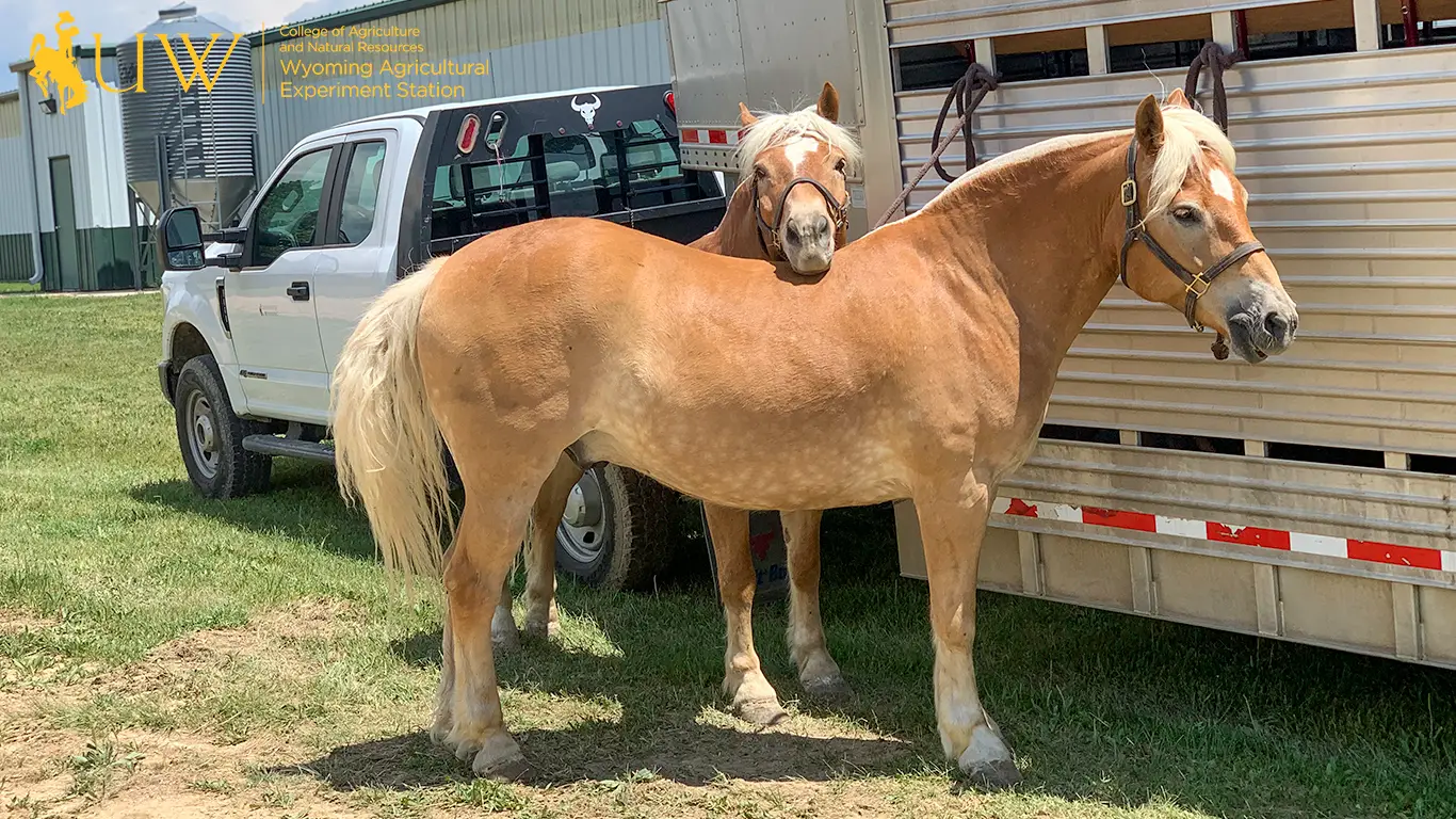 Pistol and Pete waiting while tied to their trailer.