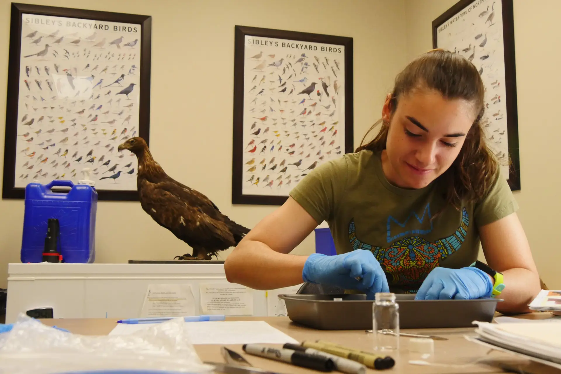 A young woman leaning over a metal tray wearing plastic gloves.