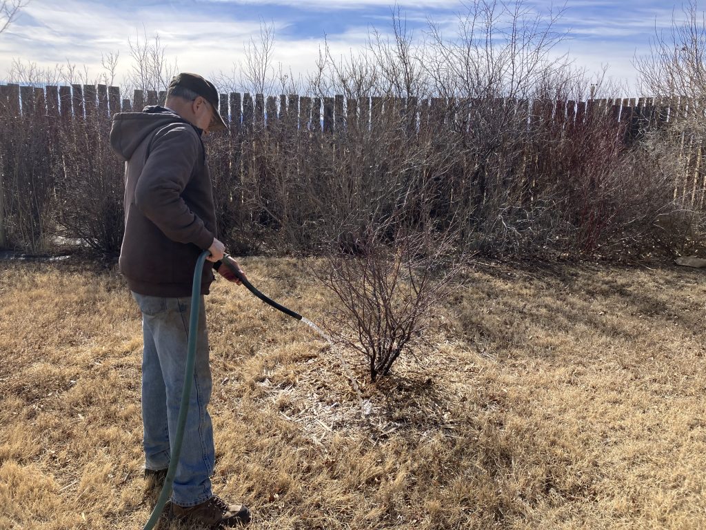 Plants do not need a lot of water this time of year; watering once a month is often sufficient. Make sure to water early enough in the day to allow the water to soak into the soil before freezing temperatures return. Also remember to drain hoses and spigots each day after watering.