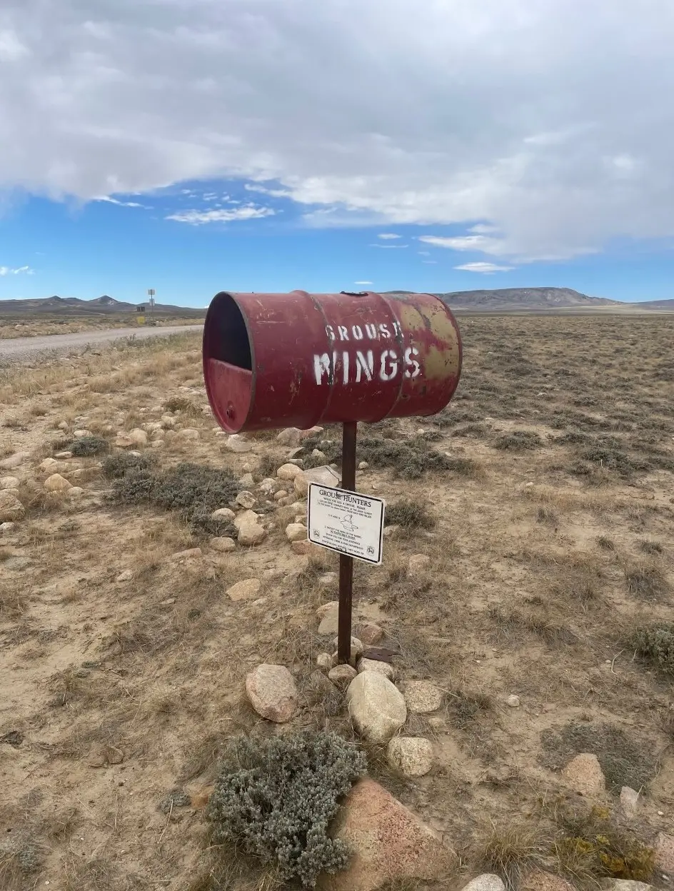 Red metal barrel on a pole with the words grouse wings painted in white.